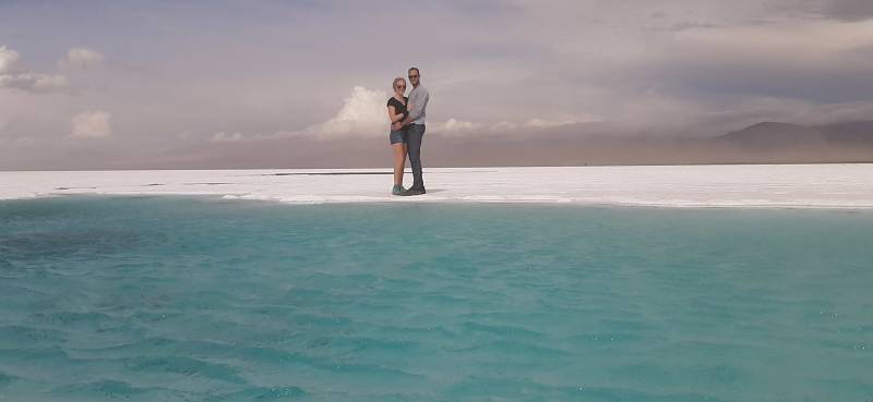 Er hingen donkere wolken boven de meren. We waren gewaarschuwd dat met regen het gevaarlijk kan zijn om zelfstandig te rijden. Voor 600 pesos, dus 9 euro mochten we meerijden met een gids die ons ook gelijk achtergrond informatie vertelde. Dit was het geld echt meer dan waard, zeker verdeeld door 4. Zo graven ze 60 cm diepe stroken van 100 meter lang en 3 meter breed. Na 10 maanden liggen deze stroken volledig vol met zout, wat vervolgens 'geoogst' wordt. Dit is dus 90 ton zout wat er elke keer verplaatst wordt!! Het water was zo zout, dat je er, net als in de dode zee, zou kunnen blijven drijven. Wel heeeeeel koud water, haha. Onze handen waren gelijk soort van uitgedroogd toen ze weer opgedroogd waren.