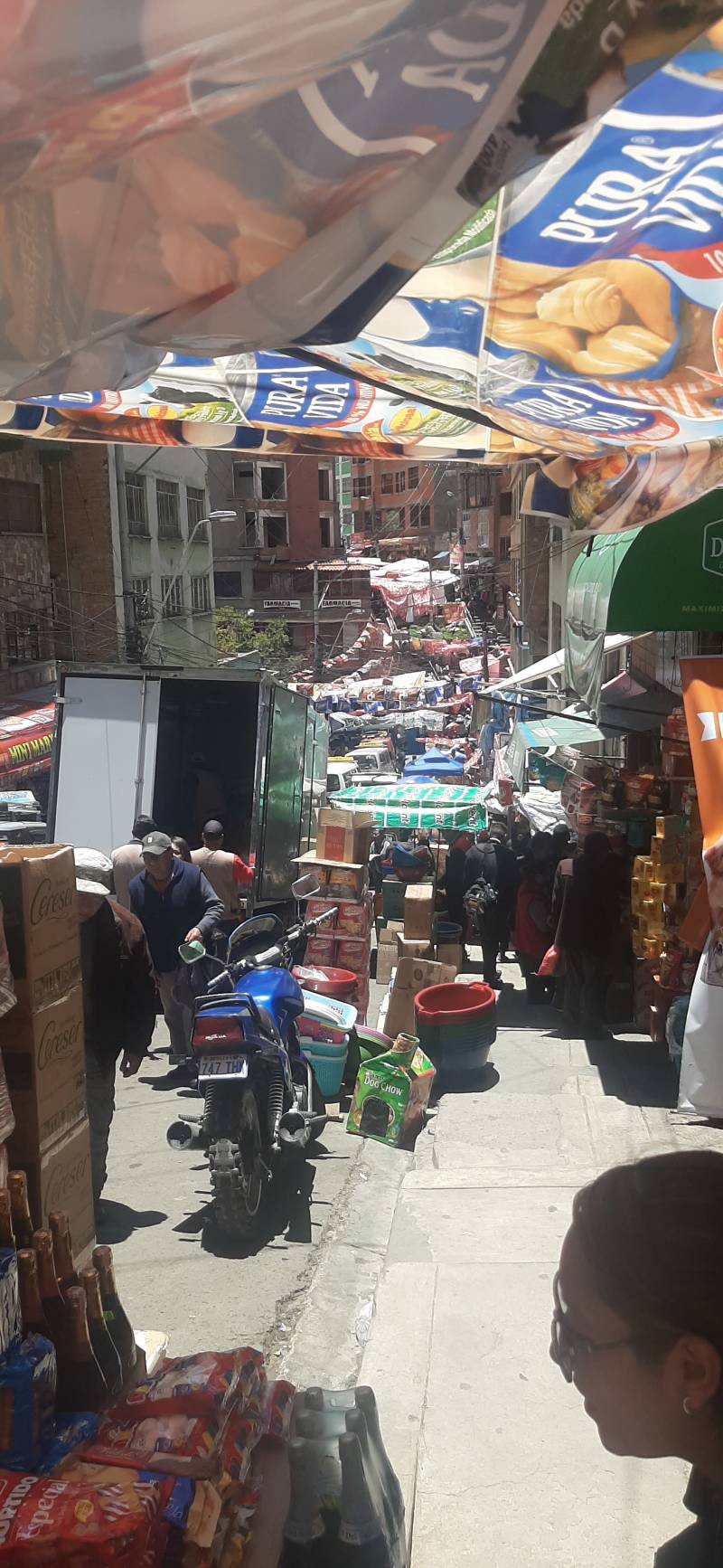 Het was enorm warm, terwijl het gister maar een graadje of 10/15 was. Wat een verschil zeg. Onderweg naar de supermarkt kwamen we langs honderden kraampjes. Er werd echt van alles gekocht, van Nikes, tot kleren, pannen, etenswaren, parilla's, leren jassen en nog veel meer. Ook voedsel lag open en bloot op straat. Vers producten die gekoeld zouden moeten worden is zo vanuit het vuistje te kopen en ook drinken en andere goedjes waren te koop. Heerlijk om deze cultuur op te snuiven. Het leuke aan locale markten is echt de cultuur. De inwoners die bossen met kruiden kopen en in hun 'rugzak' wegstoppen. Mannen met veeeeeeeel te zware dozen/emmers/tassen op hun rug die soms zelfs groter zijn dan hunzelf. Er wordt afgedwongen, hard gewerkt en gesjouwd. Echt genieten. De kraampjes staan allemaal gewoon bijna midden op straat, maar er gaan ook gewoon nog auto's en minibussen doorheen al toeterend en gebarend dat mensen aan de kant moeten gaan.