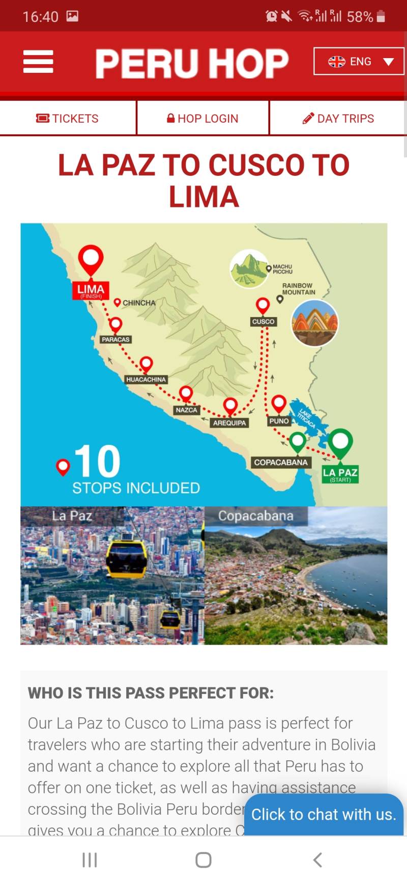 We hebben de Peru hop geboekt voor 200 dollar p.p. deze brengt ons vandaag vanaf 6.40 s morgens naar Copacabana. Hier kwamen we rond 12 uur aan. Om 17.00 worden we daar weer opgepikt en gaan we de peruaanse grens over naar Puno.